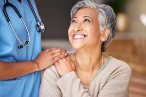 Nurse, Senior Woman And Smile With Comfort, Holding Hands Or Support In Nursing Home For Retirement. Doctor, Medic Or Caregiver With Kindness, Empathy Or Gratitude For Help, Trust Or Service In House