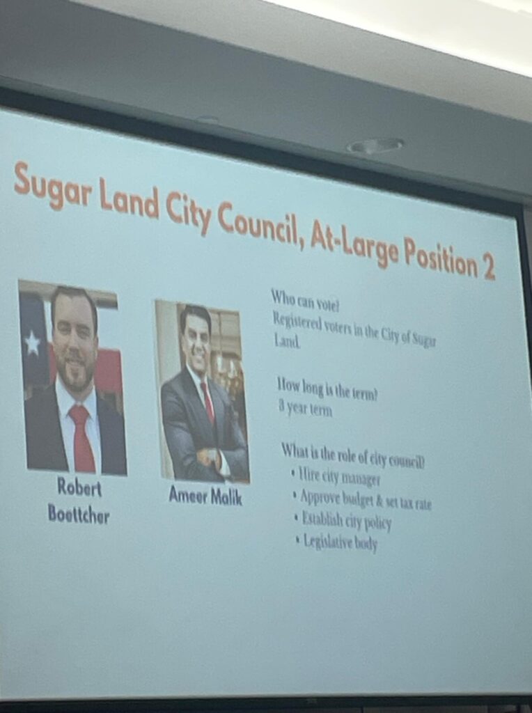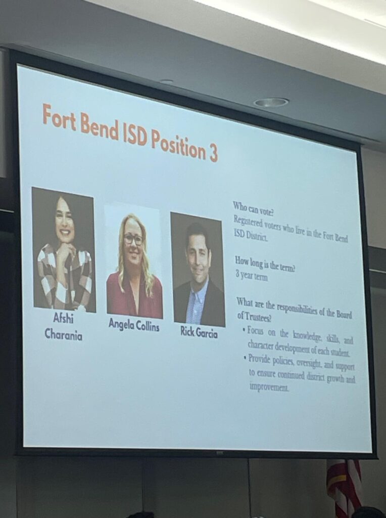 University of Houston Sugar Land was the site of a well-attended candidates’ forum for the Fort Bend ISD school board and Sugar Land mayoral and city council elections, organized by Emgage Texas and the following sponsors: Houston Voting Initiative, Alpha Kappa Alpha – Alpha Gamma Alpha Omega Chapter, Fort Bend Voters League, Baker Ripley and Wharton County Junior College. Information about some of the candidates who attended, their answers to questions, who won and who will be in the June 7th runoff election are below.