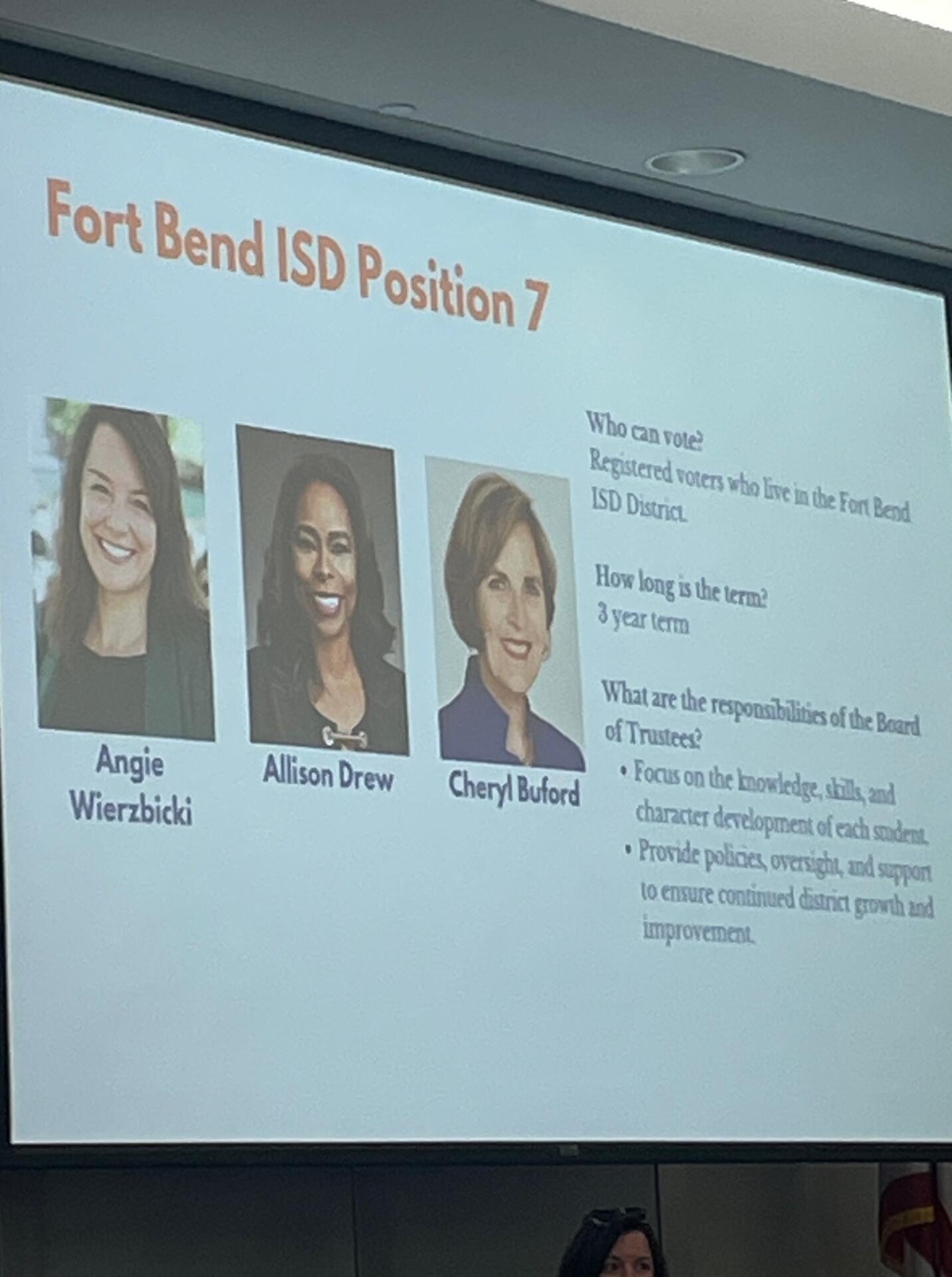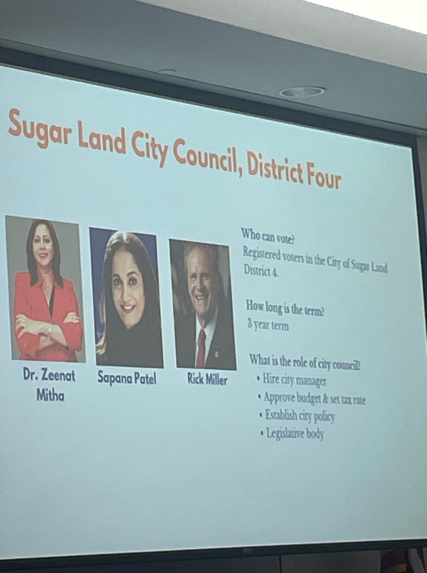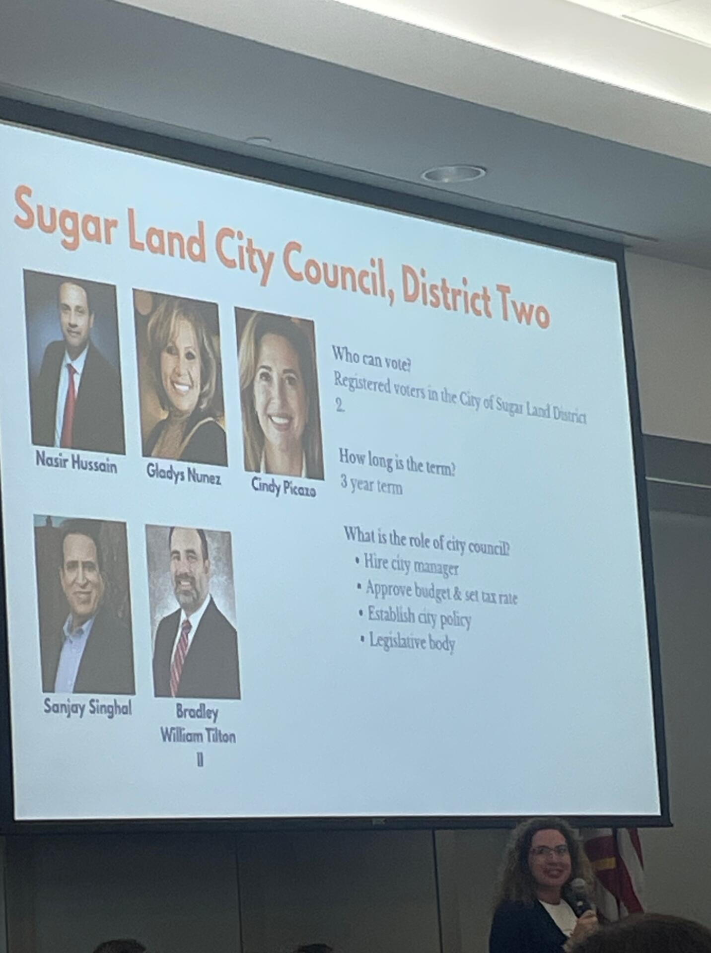 University of Houston Sugar Land was the site of a well-attended candidates’ forum for the Fort Bend ISD school board and Sugar Land mayoral and city council elections, organized by Emgage Texas and the following sponsors: Houston Voting Initiative, Alpha Kappa Alpha – Alpha Gamma Alpha Omega Chapter, Fort Bend Voters League, Baker Ripley and Wharton County Junior College. Information about some of the candidates who attended, their answers to questions, who won and who will be in the June 7th runoff election are below.