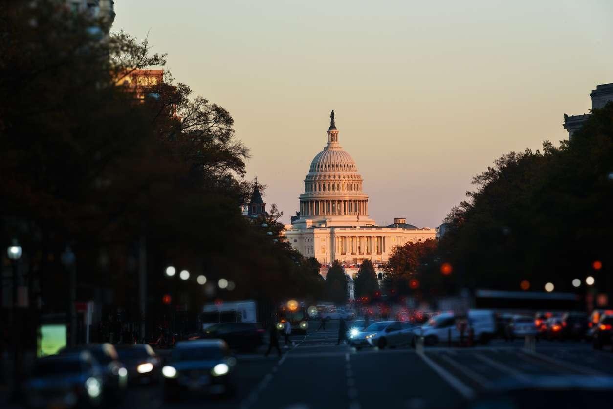 View of Capitol Building in the background from Freedom Plaza, Focusing on the background
