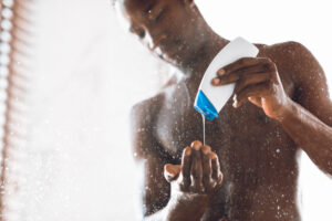 Black Man Pouring Shower Gel Washing Body In Modern Bathroom